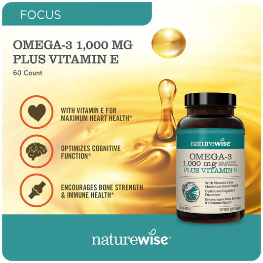 NatureWise Extra-Strength Omega 3 Fish Oil Supplement - 1000mg per Serving - 600 EPA & 400 DHA and Vitamin E - Support for Heart & Brain Health - Lemon Flavor, Non-GMO - 60 Softgels[1-Month Supply]