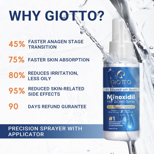 GIOTTO 5% Minoxidil for Men and Women Hair Growth Spray with Extra Innovative Applicator - Infused with Biotin, Niacinamide and Panthenol - Topical Scalp Treatment for Hair Loss & Thinning, 2 Fl Oz